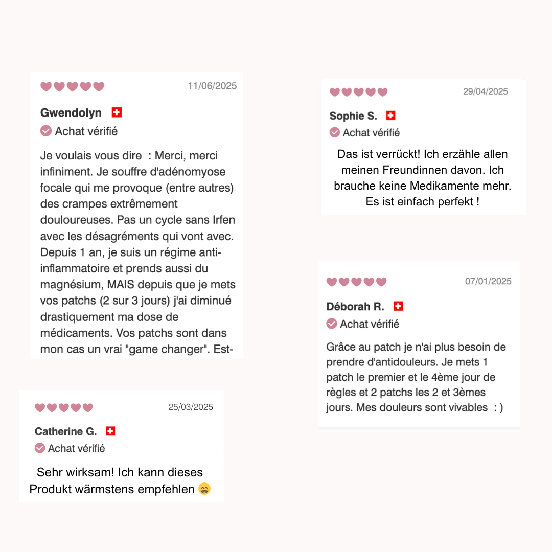Imaginez pouvoir vivre pleinement chaque moment, sans être freinée par les inconforts menstruels. Que vous soyez en réunion, en déplacement, ou en train de vous détendre chez vous, nos patchs offrent un soulagement discret, efficace et continu pour vous permettre de rester concentrée sur ce qui compte vraiment.